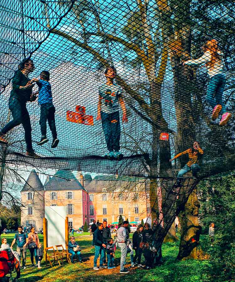 Het Parcours des Chevaliers bestaat uit zwevende netten die met elkaar verbonden zijn en in het hart van het parkbos zijn geïnstalleerd.