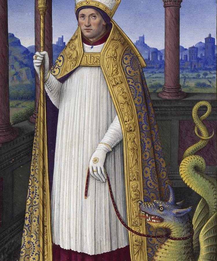Volgens de legende vernietigt Sint Liphard de draak niet. Hij tergt hem. Terrasen betekent niet doden, maar aarden.